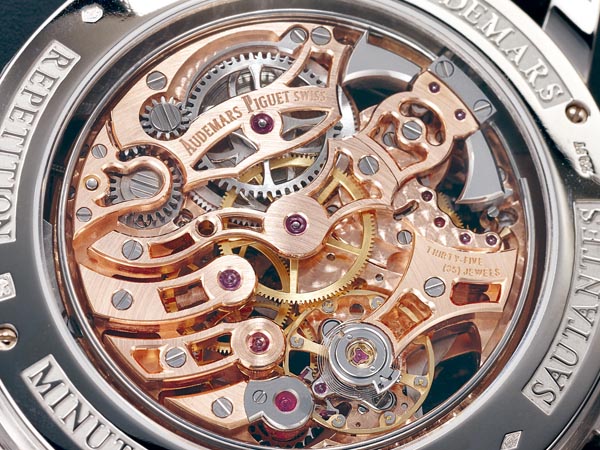 愛彼新一代的跳時三問錶,其最大的特色便是尺寸加大,不僅錶款採用43mm的大尺寸,內部的2907SQ機芯直徑亦達37mm(機芯主體為29.3mm),如此一來,最明顯的優勢就在於,報時的聲音變大聲,這就如同三問懷錶的報時聲音,遠遠大於腕錶一樣。而本枚機芯採用雙音簧與雙音鎚設計,透過透明底蓋,可以清楚看見其結構。