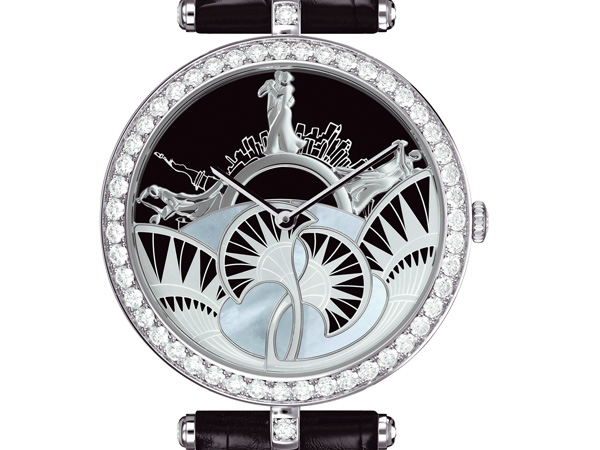直徑38mm 18K白金錶殼鑲鑽/時間指示,24小時旋轉金雕人偶/PIAGET 800P自動上鍊機芯加掛梵克雅寶專用24小時指示模組/珍珠母貝、縞瑪瑙鑲嵌面盤與金雕人物/藍寶石水晶鏡面/參考價NTD 2,707,000(實際價格以官方公告為準)