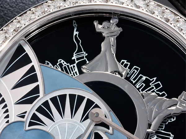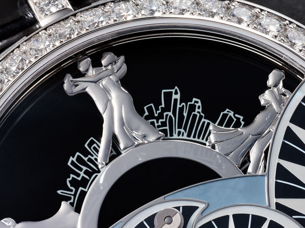 它不再是單純的工具,而是魔法道具,基礎建築在一枚PIAGET伯爵提供的800P超薄自動上鍊機芯上,再附加梵克雅寶獨家使用的24小時模組,用來推動不斷旋轉的金雕人偶,名流貴婦在黑白舞會裡裙裾飛揚,耳鬢廝磨。底蓋採實心金屬設計,刻有品牌名稱與標誌。下方站著一對跳著國標舞的男女,他們正是黑白舞會裡的主角,令人懷想紐約廣場飯店宴會廳裡翩翩起舞的身影。