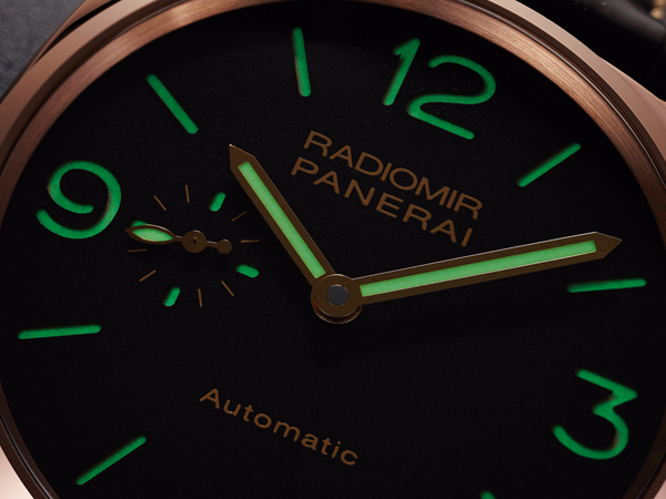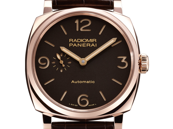 直徑45mm的紅金錶殼搭配棕色三明治面盤,夜光塗料也是復古質感的偏沙色。九點鐘方向有魚雷小秒針,有著校正時停秒功能;記憶所及,它應該是首款面盤上註明了「AUTOMATIC」字樣的Radiomir 1940款式(當然還有不鏽鋼款的PAM00572),採用線形錶耳的Radiomir系列應該也沒有任何款式能面盤上找到這個字樣。