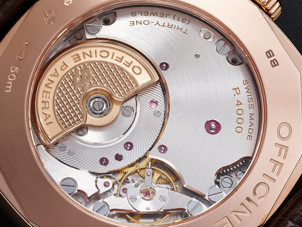 沛納海先前自動機芯P.2000及P.9000體型較厚,全尺寸自動盤也隱含不同的製錶理念,傳統微型自動盤上鍊效率明顯較弱,但在體型及外觀上卻有優勢,看來顯得精雕細琢。容易留給人高級工藝品的感受。P.4000會隨著搭配錶殼不同而配用不同自動盤,紅金款就配22K玫瑰金自動盤,不鏽鋼款則搭配鎢合金自動盤。