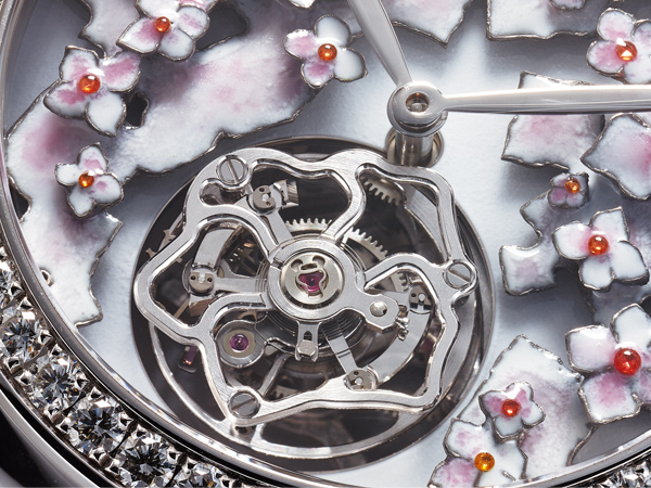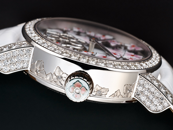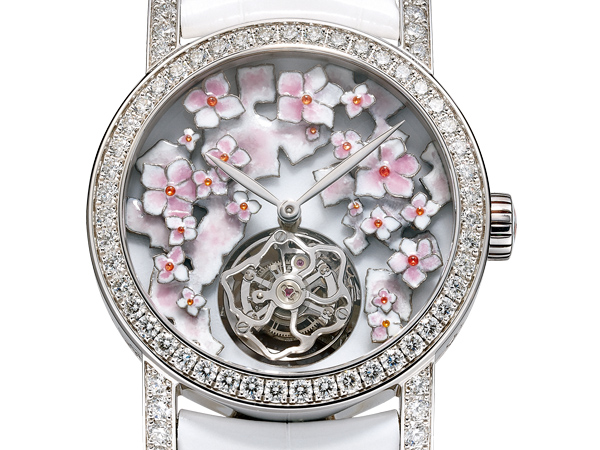 這款腕錶因外型、工藝技術還有新穎設計主題,成為2014年日內瓦高級鐘錶大賞最佳女裝複雜功能錶的入圍錶款。最吸人眼球的,便是大明火琺瑯面盤上滿滿的花朵,除了指針與陀飛輪外,沒有任何時標和符號點綴於上。錶殼、錶耳鑲滿圓形鑽石,錶殼側面與錶冠皆刻有繡球花圖案。