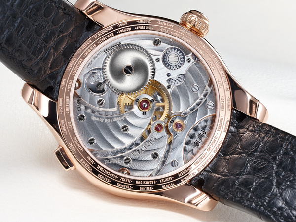 底蓋邊緣銘刻了北半球24個城市與南半球20個城市的名稱及其對應的時區,可於推算世界各地時間時使用。38.4毫米的機芯不僅大器,還有很高的精緻度。