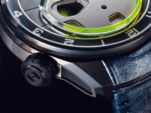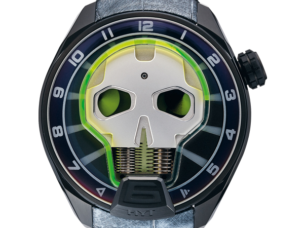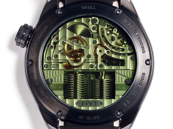H1 Skull的面盤上有兩個看似引擎汽缸的泵浦,用來儲存液體指示時間,它的心臟是不折不扣的機械式機芯,以28800VPH的振頻運作,但推動的不是指針或轉盤,而是泵浦,泵浦中貯藏了獨家配方的兩色液體,液體會在透明細管裡流動,兩種不同顏色的交界,就用來指出時間。
