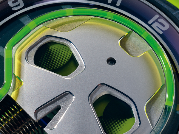 面盤下方的兩枚泵浦用來推進液體,當一邊伸展時,另一邊則收縮,精密的動作配合讓液體精準地指出時間。也因為兩個泵浦間只有一條透明管相通,因此它才需要在每到六點進行一次逆跳的動作。