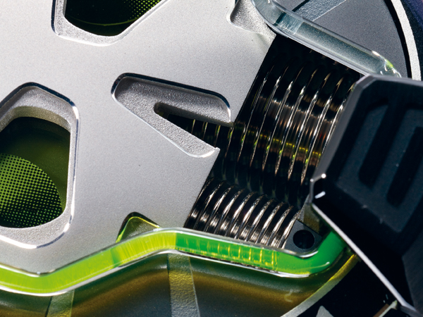 液態系統的動力來自機械機芯,它無疑能夠穩定輸出,但液體的體積會受溫度變化影響,指示就可能不精準。泵浦裡有獨特的機構處理這個問題──雖然它的外觀是兩具泵浦,但實際上在左側的泵浦裡,還有一具小泵浦,裡頭儲存著非常特別的液體,絕大多數液數都恪守熱脹冷縮的原則,但這具小泵浦裡的液體卻跟攝氏0∼4度時的水一樣,是冷脹熱縮的,PRECIFLEX經過嚴謹計算,用它來彌補溫度變化所造成的體積誤差。