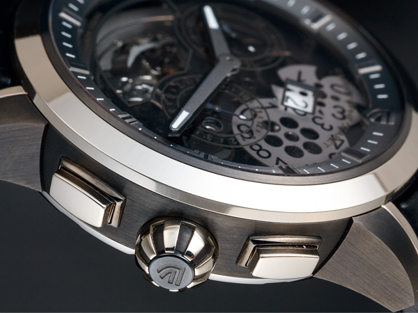 Allergo的設計就像一幀腕錶齒輪傳動經絡圖,一如前文提及,六點位置特別強調的透空視窗,能一探啟動三問時的連串齒輪連動,同樣的,其他功能也同樣熱情放送。二點位置日期快調,按壓後可以清楚見到槓桿如何撥動齒輪,並牽連兩片日期盤連動。