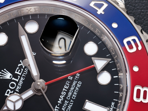 具鮮豔色彩的陶瓷材質,一直是錶廠比較難克服的問題。過去勞力士已推出綠色、藍色的陶瓷錶圈,但是紅色本身沒有穩定的礦物顏料,因此廠方耗費多時才得以完成紅色錶圈的燒製步驟。不過要結合另一半的藍色錶圈,則又是另一大難題。因此勞力士將代表夜間的半邊錶圈浸入特定的化合物溶劑,再經過攝氏1600度的高溫燒製,最後陶瓷變的緻密且堅固;添加化合物的這一半錶圈,會轉變成湛藍色的樣貌,而另一半則呈現紅色,展現出對比鮮明雙色錶圈。