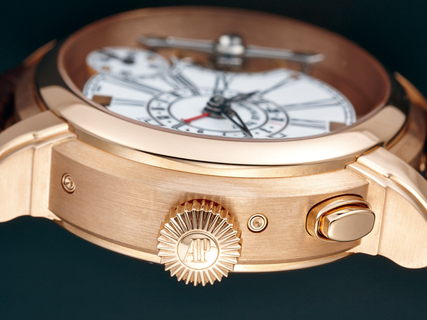 佈局還是以指示時間為主,搭配慣常需要用到的中央日期指示。而相對少使用的月份與星期則安置於十二點與六點鐘視窗。雖然四年才需調整一次,但愛彼還是考量使用者方便,於錶側兩點位置安置快調按把,按壓後日期、星期、月份都會連動調整,無需各個調整。當然,若有其餘意外狀況,需要各別調校,錶側亦有隱藏按鈕,可針對單一指示調整。