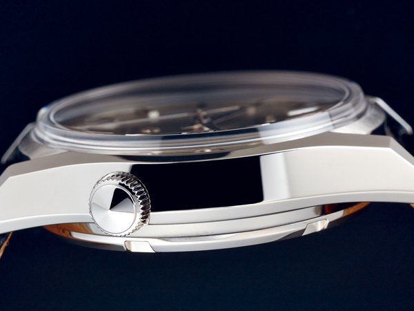 本錶款的錶殼線條採用多切面設計,主要都集中在錶耳兩側,較為纖細的錶耳,也是與44GS、57GS迥異的地方。除此之外,由於62GS沒有錶圈設計,因此必須採用圓弧形的藍水晶玻璃鏡面,相較於昔日的壓克力玻璃,製作成本應該超過百倍以上。錶款的面盤採用緞面放射太陽紋飾,與先前GS所使用的放射紋略有不同;而多切面的長形立體時標,以及修長如刀鋒的劍形指針,都可看出細膩的拋光工序。