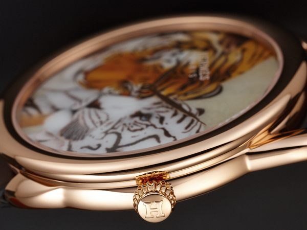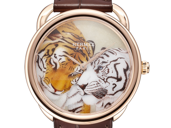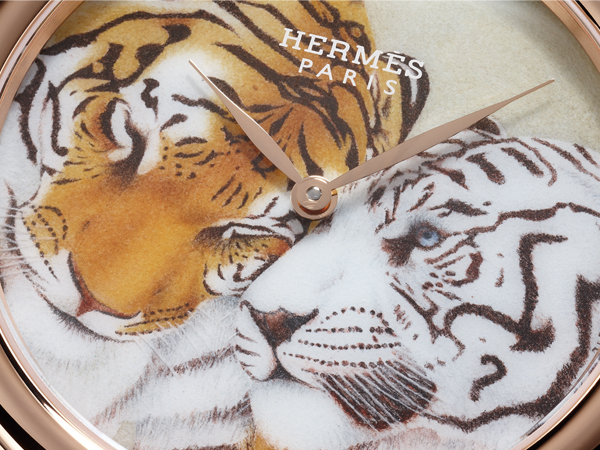 愛馬仕以馬具起家,但它的歷史作品中偶爾可見其他動物,1977年由設計師Christiane Vauzelles所設計的「王者之虎(Tigre Royal)」絲巾圖案就是其中之一,圖案除傳統色澤之外,有金碧輝煌之意;本錶面盤「輕撫中的老虎(Câlin Félin)」則是攝影作品,作者是法國設計師Rémi Bourquin,他周遊列國,特別喜愛在動作園中取景。這款Arceau Câlin Félin琺瑯錶,雙色猛虎相依相偎的畫面傳世極稀,兩虎不肥不瘦,氣勢凌人。