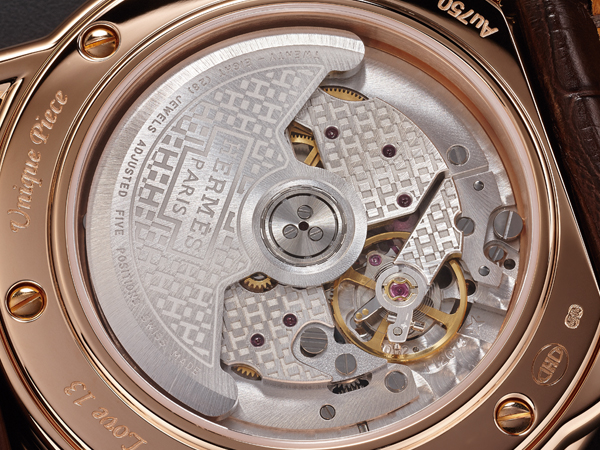 透明底蓋能看見H1837自動上鍊機芯。這是愛馬仕倚重的自製機芯,直徑是現代最常見的11-1/2法分,儲能為50小時,雙發條盒設計,機板上有珍珠圓點紋,自動盤上偏佈H字母鐫刻。這枚機芯以傳統游絲搭配光擺,游絲的螺絲微調結構是極常見的設計,結構簡單效果確實。它是小三針基本設計,但在這款錶上只用了雙針顯示。