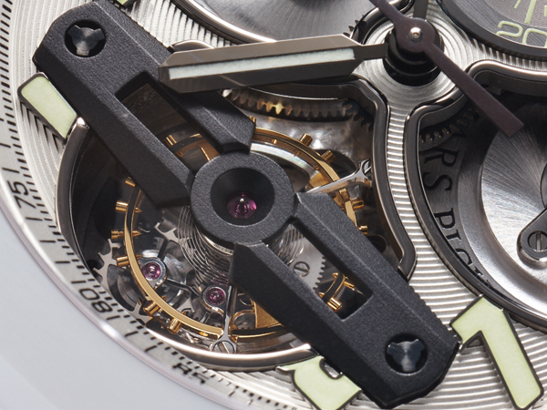 高科技感外觀讓細節上的講究莫名地被忽視:例如雕琢極為精緻的面盤,為了發條盒及陀飛輪橋板開了三個大洞,其上的同心刻紋、鑲貼時標及轉印字體儘管製作過程極為不易,但風采迅速被三塊超現實的鍍黑鋁合金橋板搶走;唯有靜心凝神,才能看出它的滋味。