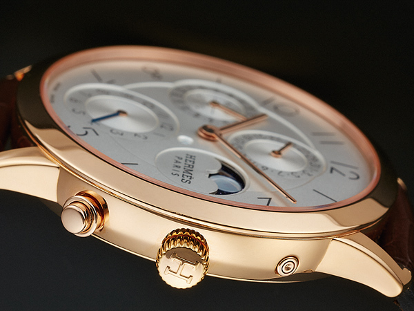 這款錶的六點鐘方向是獨特的第二時區指示,在一般的萬年曆錶中極少出現這個選擇,但對現代人而言,堅持單一時間與在不同時區內悠遊的機會幾乎一樣多,加上第二時區指示似乎也是個極為合理的選擇。而愛馬仕更為這項功能做了最突出的強調,品牌特地設計了四點鐘方向的按把,可用來快調第二時區時間。