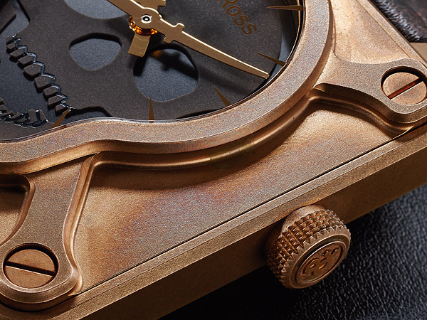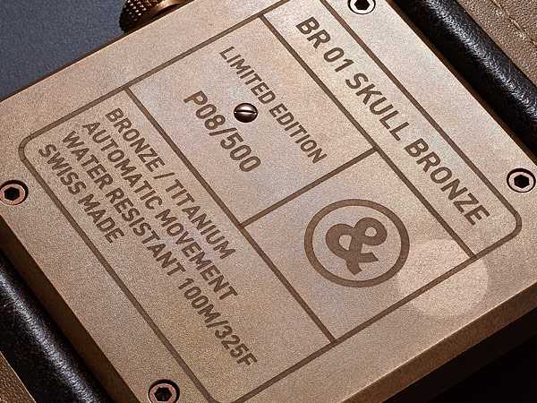 此款BR01 Skull Bronze以同樣典故重新發表,將原本的不鏽鋼鍍黑錶殼改為運用近兩年所流行的青銅材質。以92%的銅以及8%的錫所混合出的銅合金,全新時呈現赤金色,只要接觸空氣後便會開始氧化。隨時間推移,若沒特別上油保養,便逐漸生成銅綠,加上經歷風霜的年代感,也創造出更具有個人風味的樣貌,成為更獨一無二的存在。