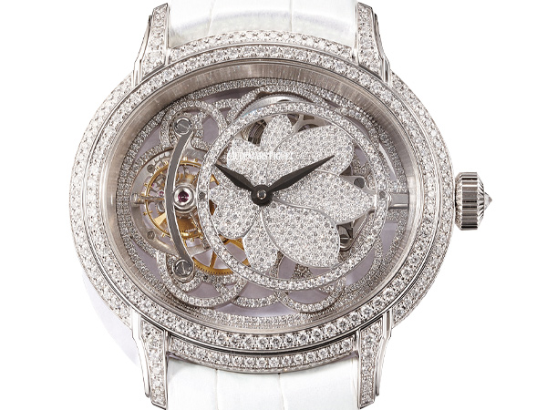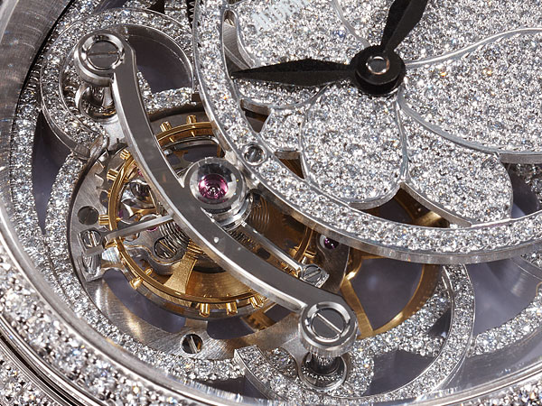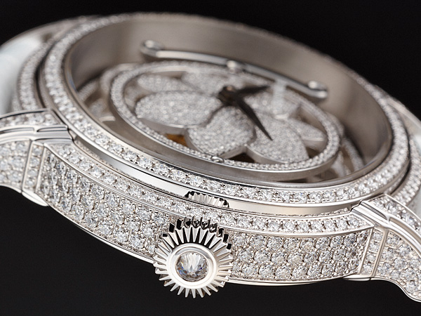 這款錶的鑽石鑲嵌令人難以忘懷,因為它不只在錶殼上,還在面盤及機板上,錶殼上共有424顆鑽石,重3.95克拉;面盤上有504顆,重1.12克拉;機芯上有213顆鑽,重0.25克拉。對無鑽不歡的人來說,這等鑲嵌密集簡直進到心坎裡,而在花朵造型的面盤上採用雪花式鑲嵌,所浮現的光芒更令人拍案。