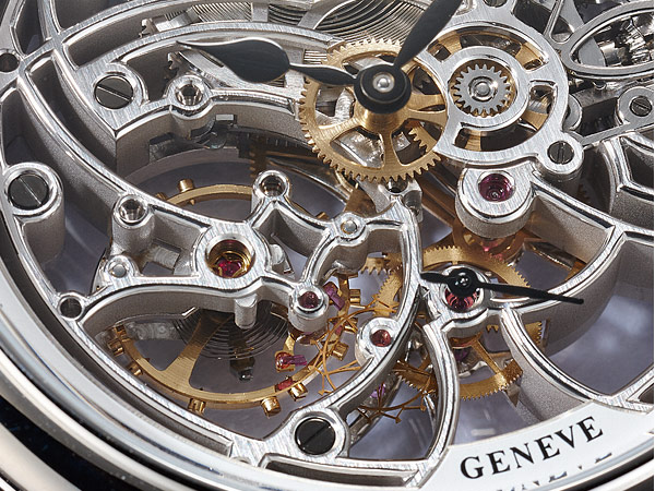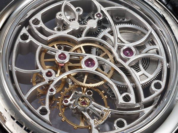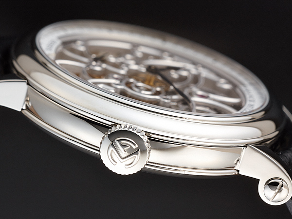 7 Days Power Reserve Skeleton又是品牌一款精美的鏤空作品,透過鏤空面盤與底蓋可一窺見它的運作奧祕,手工倒角機芯夾板上鑲嵌二十五顆寶石,透過立體曲弧錶面觀賞,可感受到機芯零件排列得嚴實有致、清楚俐落。