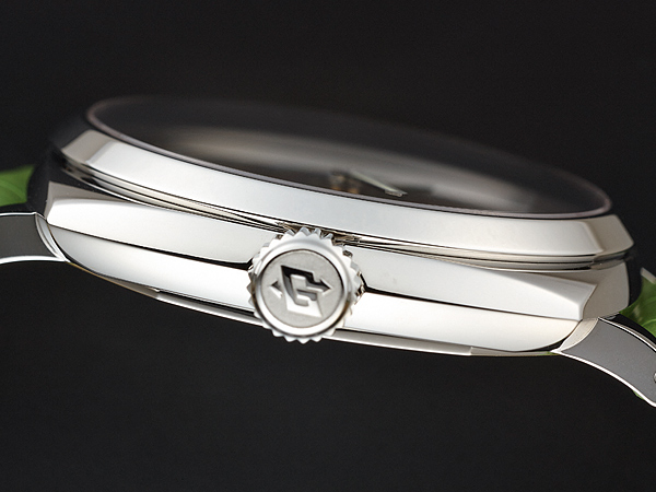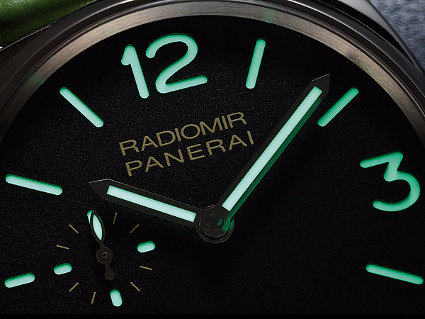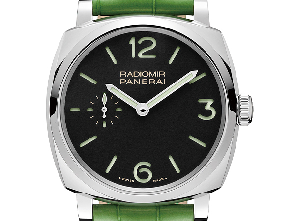 而首次搭載P.1000機芯的是新發表的Radiomir 1940 3 Days腕錶,除了有尊貴的18K紅金版本之外,還有這款首次搭配綠色鱷魚皮錶帶的款式,是品牌過去未曾嘗試的組合;不過其實沛納海的專賣店早已提供不同色彩的鱷魚皮錶帶,相信死忠的錶迷應該早就知道這個消息。由於P.1000機芯的尺寸因素,本錶款使用42mm的尺寸設計,從側面觀看,也可以發現厚度明顯輕薄許多。
