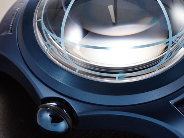 而Bubble Sphere2除了錶殼經藍色PVD處理,指針也搭配藍色Super-LumiNova夜光塗層,讓整體看起來更為一致。另外,有別於之前推出的泡泡錶,今年的改款除了將錶徑從原本的44mm改為47mm,錶鏡的厚度也從1cm縮減為0.8mm,錶徑尺寸變得更大,凸起的球面厚度比之前少了0.2mm,經過調整的鏡面弧度讓易讀性更為提升。