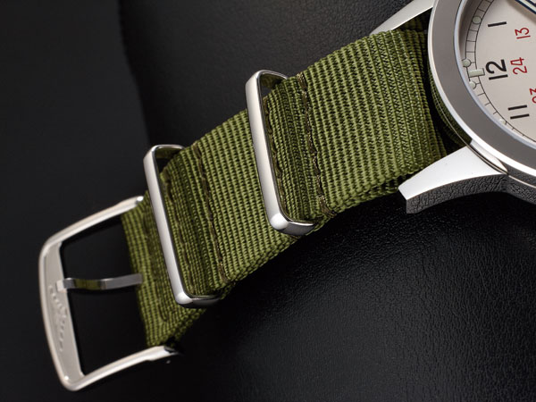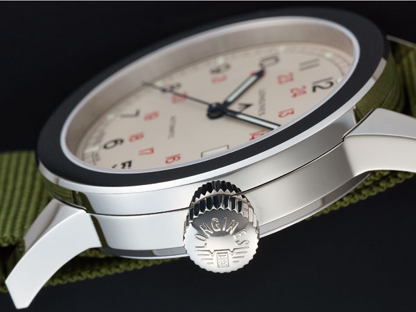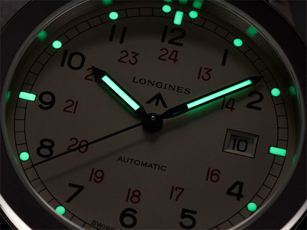 而和當年的版本相比,COSD復刻款的面盤顏色將純白改成乳白,在三點鐘位置增加了日期視窗,指針從鏤空改為夜光塗料版本,當時為了作戰時方便操作的大錶冠也做了調整。面盤最外圈的軌道式刻度搭配圓形及棒狀夜光時標,往內一圈大型阿拉伯數字以黑色追求清晰顯時,24小時顯示的紅色時標則在內層指示,以三層環繞的方式強化軍錶需具備的快速簡易讀時功能。