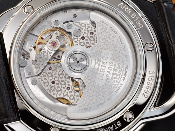 除了機芯結構費心琢磨,愛馬仕在結構的裝飾上也多有用心。透明底蓋可見機芯夾板與自動盤佈滿象徵愛馬仕的H字樣凹槽,雖是裝飾,但在打磨拋光等修飾處理上都比一般做法耗時費工,成本雖然增加,但也成為品牌機芯別樹一幟的風格。