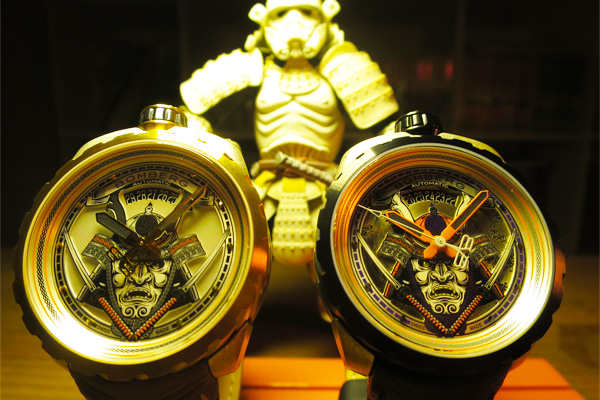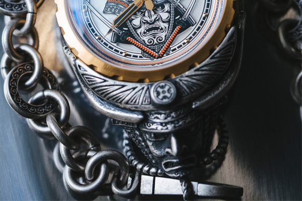 這次選了兩種款式,兩種錶殼兩種面盤。皆採舊化處理的不鏽鋼底座,其一為黑色PVD處理不鏽鋼錶頭。黑橘色的五十頭盔後,襯著的是有著獨特紋理的舊化銀質面盤,獨特的金屬感,配上武士頭盔,讓整只面盤宛如浮世繪一般。非常日系,非常有味。另一款則是金色PVD錶頭,金色指針與黑白武士。而襯在背後的則是光彩變換的珍珠母貝底盤。形象不是黑款強烈。如果說黑色款為戰國時代,刀尖來火裡去的武士。那此款便比較像是承平時期,講武論道的貴族武士。