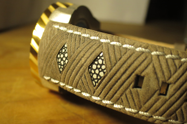 看BOMBERG奔放的外表,就知道這個品牌不是採用公版殼,都是特別開模做的。而要順應殼的造型,錶帶也需要特別設計,因此能與錶款有更緊密的連結。Samurai限量版的錶帶,便做成了武士刀握把纏布的樣貌,非常獨特,也非常吻合腕錶整體的設計感。