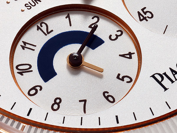 伯爵現役的萬年曆機芯就只有這枚855P,它首度於2008年發表,之後也只有使用在Emperador Cushion上頭;這枚機芯最大的特徵就是它採用了兩種逆跳顯示來構成錶面的功能,這兩個逆跳分別是三點的日期和九點的星期。