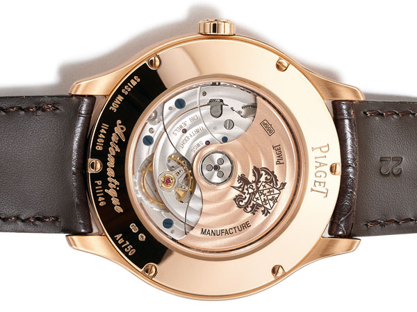 Gouverneur是第二個搭載855P的系列;這個名字其實是取自過去PIAGET的一個舊款,不過設計上的概念卻是完全的新作。系列的特色在於使用了圓形和橢圓的套疊來形成錶款的幾何構圖,這種做法乍看之下只是在玩視覺遊戲,似乎有點失了Black Tie系列作為正裝錶的古典端莊,然而進一步玩味它的設計語彙卻是愈看愈有味道,設計師謹慎地利用字型等等細部元素控制住整體的調性,讓幾何套疊的玩心在這裡不至於顯得輕浮,反而在近年趨於僵化的正裝錶設計中注入了一股新鮮感,成了目前市場上別具啟發性的一個例子。