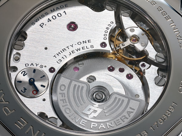 因為使用P.4001機芯的錶款,面盤上是看不到動力儲存顯示,但使用P.4002機芯的錶款,可以在面盤五點鐘位置,看見半圓形的動力儲存顯示指針。因此P.4001機芯的動力儲存顯示,是位於背面的機芯夾板之上,採用圓形指針式設計,滿鍊時指針會指向3,代表擁有3天的儲能;過去廠方也曾在P.9003機芯上使用類似的功能,不過卻是以旋轉圓盤(上面有0到3的數字)搭配三角指示箭頭的設計。