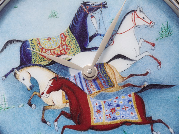 這個構圖移植到面盤上之後,取局部畫作的四匹駿馬為主軸,製作了湖水藍和象牙白兩只的客製套錶。細將面盤上的馬匹和餐盤上的圖案比對,會發現馬身和披巾的顏色不全然相同,連地面上草的顏色也比原畫作來得輕柔,以色調的微調讓馬匹的主色澤和面盤底色顯得更互搭,視覺看起來也更舒適柔和。