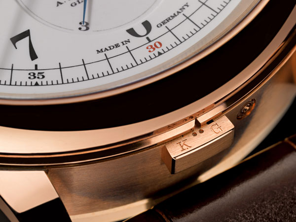 本錶款採用早期的單按把計時結構,因此1點至2點鐘位置的為計時按把,而10點至11點鐘點位置為追針計時按把,負責控制藍鋼雙追針。除此之外,錶款還具備昔日高複雜計時懷錶常見的閃電跳秒功能,位於面盤六點鐘位置的1/5跳秒針,每秒鐘會走完一圈;由於本枚機芯的振頻為每小時18,000轉,也就是每秒鐘擺輪轉動五次,因此啟動計時功能之後,秒針精確地以2.5赫茲跳動。