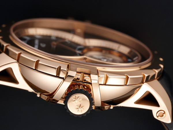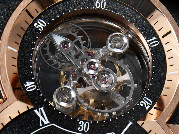 因為本枚機芯的飛行陀飛輪裝置,採用偏心式設計,與以往擺輪與旋轉軸心同軸的設計不同,反而是擒縱叉的軸心接近結構中央,而擺輪與擒縱輪環繞著軸心轉動,因此視覺效果反而勝過傳統陀飛輪。而廠方為了提升視覺美感,特別將上層的不鏽鋼框架,改用藍寶石水晶玻璃,由兩側的螺絲鎖入固定,不僅提高陀飛輪結構的可看度,並能呈現飛行陀飛輪的整體美感。陀飛輪每60分秒旋轉一圈的設計,也成為小秒針指示。