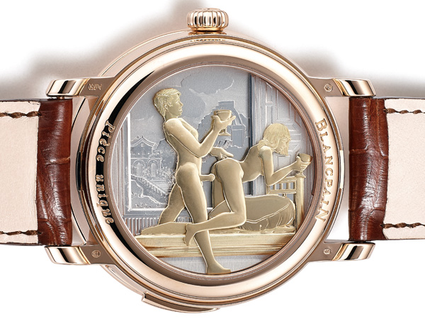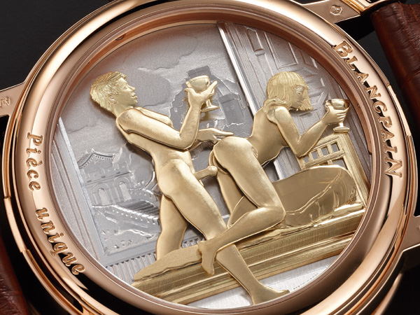 春宮錶是鐘錶複雜功能中妙不可言的一種;基本上一款錶只要創作主題中帶有情色要素的都統稱為春宮錶,是以單純在面盤上彩繪男女性事的叫春宮錶,2015年RICHARD MILLE能以手動機關任意排列組合挑逗字句的Erotic Tourbillon也算是繼承了春宮錶的精神,不過這裡我們要談的,是特指以動態呈現性愛情境的活動人偶春宮錶——BLANCPAIN寶珀La Brassus Carrousel Répétition Minutes卡羅素三問腕錶。