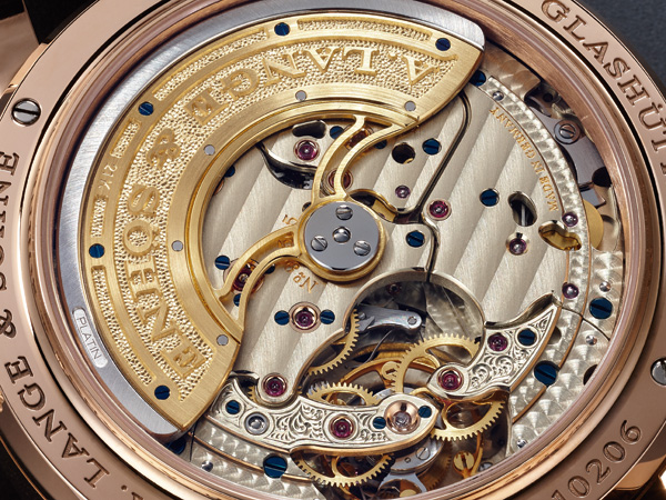 但儘管如此朗格對這顆陀飛輪還是做足了功夫,甚至同樣裝備了品牌得意的停秒機構,只要將錶冠拉出到調校段位,V字形帶有彈性的煞車片就會抵向陀飛輪籠架,從而煞住整個裝置,讓錶款得以進行精密對時。其實如果從陀飛輪原始的創制目的著眼,露不露原本不是什麼大問題,而加裝了停秒裝置更是讓實用形象大增,展現出品牌真的將它視為一種機能構造的態度,而如果買錶人能夠認同這樣的用心的話,或許也更能接受他們對於陀飛輪的低調處理吧。