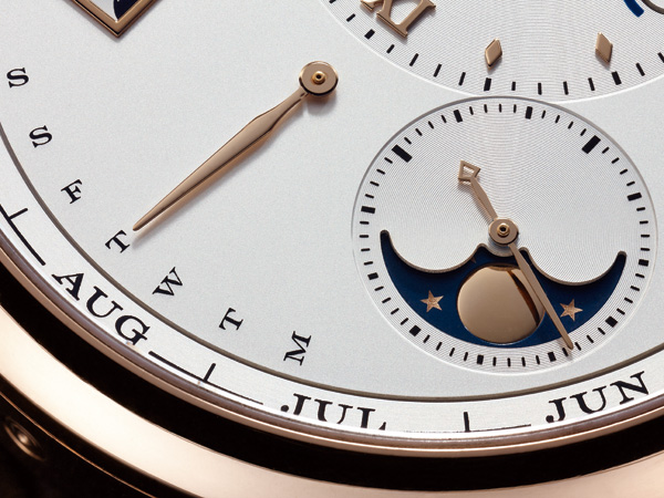 Lange 1的偏心配置原本就已經為錶面釋放出不少空間,雖然多少犧牲了時、分針盤的尺寸,但卻讓錶款在處理顯示資訊時多了許多餘裕;Daymatic已經將大日期和逆跳星期做了相當妥善的安排,陀飛輪萬年曆款則是透過整合的方式(月相整合進小秒盤、閏年窗和月份指標合而為一),讓面盤儘量維持Daymatic的格局,創造出這款設計成就極高的萬年曆錶。