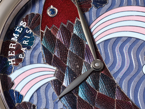 這款懷錶最特別的地方,在於將甲蟲鞘翅細工鑲嵌(scarab beetle elytra marquetry)、金雕與內填琺瑯三種工藝同時呈現。面盤的圖案來自由平面設計師Pierre Marie為愛馬仕設計的沙灘巾,一條破浪而出的飛魚躍然在錶面上。