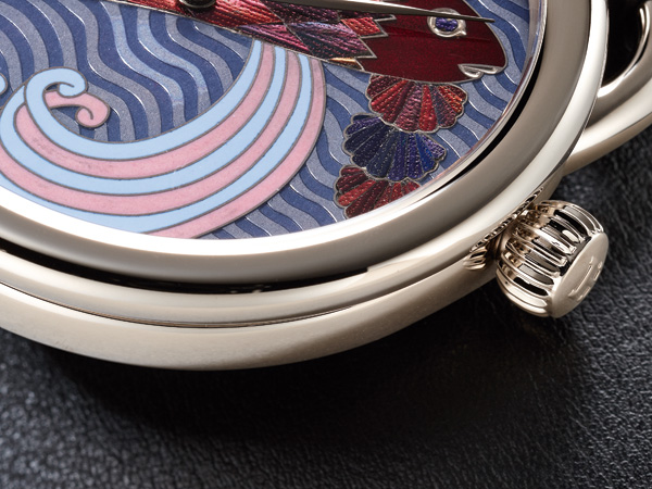金雕職人先在基板上描繪出面盤圖案,之後開始進行鐫刻的工序,接著便是大明火燒製的琺瑯步驟。琺瑯工匠先將濕的琺瑯粉末,均勻沾附在微小的筆觸上,仔細填入金雕的底座中,著手上色的程序。面盤上象徵波浪的紅、藍紋飾便是以琺瑯製作的工序,而經由多次反覆的高溫燒製,呈現出半透明感般的飽和色澤,每道波浪的顏色都不完全一致,反而造就出不同色澤的層次。