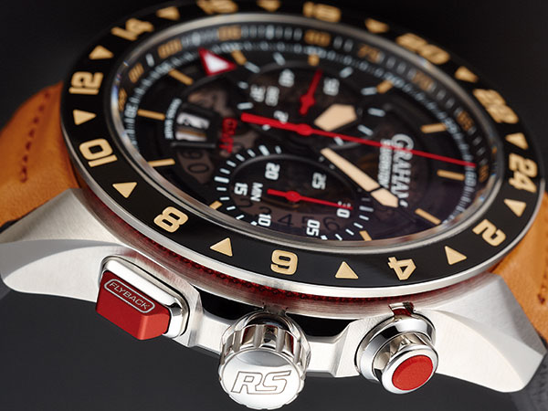 雖然沒有採用格林漢著名的特殊計時按把,這款計時碼錶還是很品牌特色。就算撇開好用的兩地時間、大日期顯示功能不說,光是視覺上的吸引力就足以一擊中的。