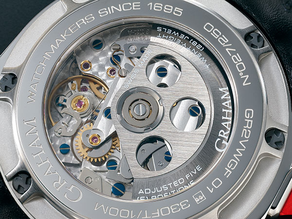 GRAHAM格林漢在2015年推出的這款兩地時間計時碼錶,採用了較少見的透明面盤設計,因為過去的Silverstone系列中,廠方曾推出面盤局部鏤空的設計,但仍無法看到其他機芯結構;在本款腕錶中,使用者可以欣賞到大日期結構以及30分鐘計時輪系的運作。