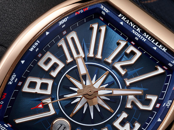 藍色主軸呼應Franck Muller Yacht 55遊艇的顏色,面盤中央的風向圖圖案,進一步貫穿錶款的設計方向。若是仔細查看,也不難發現安置在指針中軸的風向圖圖案並非單層設計。除了最上層的金質裝飾外,在最下層面盤上壓印著一層與面盤幾乎同色系的圖案,彷彿從內向外擴張一般。如此配置也讓面盤層次感更加豐富。