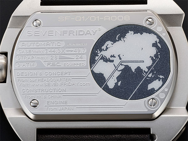 SEVENFRIDAY從不採用透明底蓋,但底蓋設計卻也有一番別出心裁。底蓋的世界地圖標誌背後暗藏了NFC(Near Field Communication)晶片,這是一種短距離的高頻無線通訊技術,能使裝置近距離無線傳輸資料。透過此機制,錶主可以透過手機等3C產品,下載應用程式,直接在原廠的資料庫登入保固。