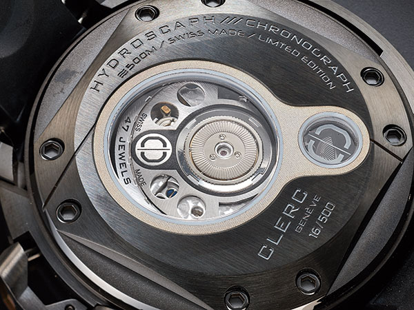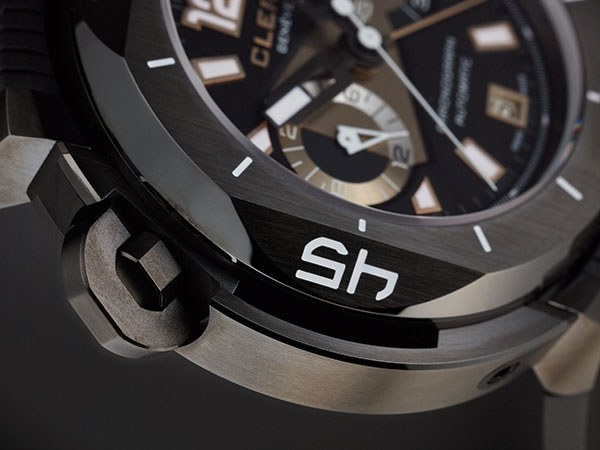目前CLERC旗下的三大系列,皆是著重於日常生活使用的錶款,其中最複雜的莫過於Hydroscaph中央積算計時碼錶。傳統的計時碼錶大部分都採用中央計時秒針與小積分盤設計,這樣的配置在讀取計時數據時,稍嫌麻煩。因此廠方設計出計時秒針與計時分針同軸的設計,可計算60分鐘內的時間。
