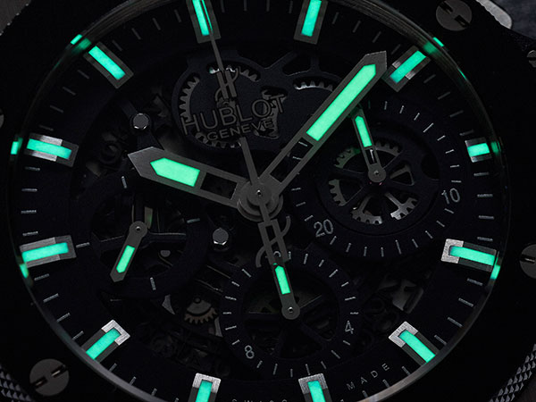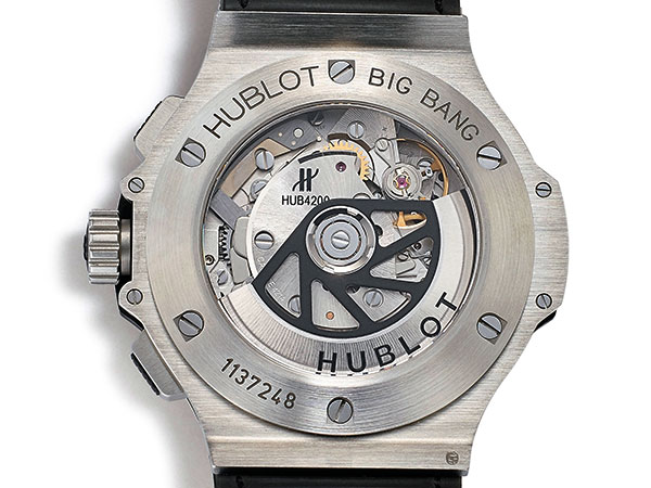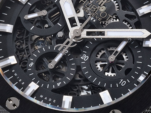 錶款內裝Hub 4212自動上鍊機芯,有別於如今品牌大量運用的自製Unico機芯,這是以Sellita的SW500為基礎所改革的計時機芯,追本溯源則是以7750為依據。結構成熟、穩定頗值得信賴。機芯主要改革在於將機板部分鏤空處理,並以透明水晶做為日期環。採用鏤空面盤,呈現帶有現代工業風的複雜感。自動盤雖然大幅透空,但由於採用質量較重的鎢金屬,不致影響上鍊效率,黑色自動盤視覺上也更呼應整體風格。
