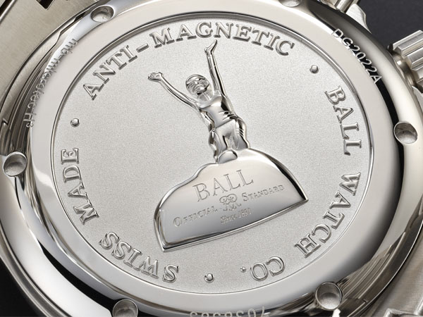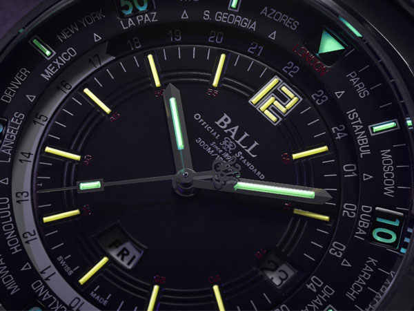 面盤的中央指針用來指示本地時間,往內的數字圈是以黑白雙色區隔日夜的24小時顯示圈,和對應的城市圈結合指示世界時間,兩點鐘位置的旋把用來調整城市圈,面盤最內圈則以紅色數字標示,和分針對照可用來對應測量剩餘潛水時間。防水300米適用於深潛,因此視讀性也顯得很重要,BALL獨家的H₃自體發光微型氣燈自然是基本配備,最外圈以綠色的氣燈顯示,而面盤中央的刻度則是由31支黃色氣燈所組成,當密封在微型玻璃試管內的H₃氣體撞擊管壁內部的著色表面時,氚氣受到激發而散發冷光,是二氧化碳鐳射技術的運用,不需經由外部光源照射也能自體發光,在深海中也能確保讀時的清晰。