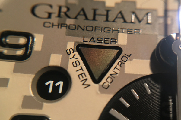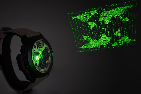 特別的是面盤九點鐘位置、標示著Laser Control System(雷射控制系統)字樣的倒三角板。這個系統不是真的可以用雷射控制什麼,或是作為飛彈瞄準目標,這個以奈米技術完成的設計,在用雷射照射時,會反射出兩片相反,以麥卡托投影法完成的世界地圖以及經緯線,設計頗為有趣,彷彿正在規劃某個行動般。