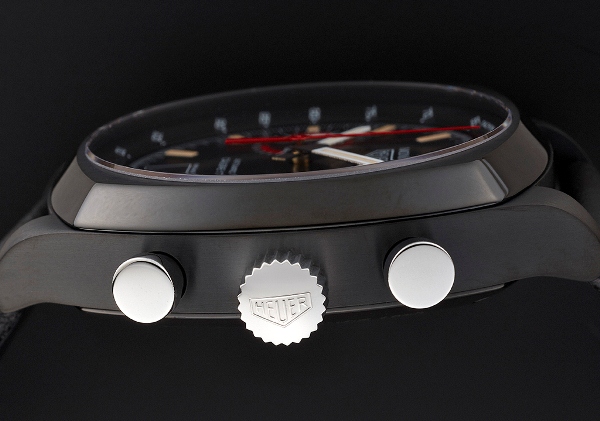 除此之外,由於當年的鍍膜技術還不夠成熟,因此廠方選擇使用銅合金錶殼搭配不鏽鋼底蓋,來提高錶殼鍍膜的效果;在當時,許多使用金色鍍膜的錶款,同樣是採用銅合金材質。不過,本款Monza計時碼錶,則採用了輕盈堅固的鈦合金材質,而且拜現代科技所賜,用於沖壓與鍛造工具的碳化鈦鍍層,亦能輕鬆的運用在鈦合金錶殼之中。