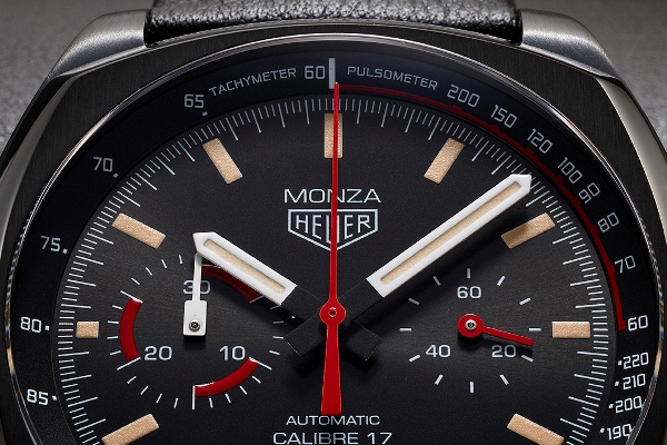 雖然錶殼外型與昔日款式有所不同,但是面盤的設計,可說是原汁原味的呈現其樣貌。其中最特殊的地方,就是廠方將Pulsometer脈搏計與Tachymeter測速計合而為一的設計,因為面盤與錶圈的外緣空間有限,通常只會使用其中一種。不過測速計的第15秒的速度,仍高達240公里左右,對於日常生活的實用性幾乎為0,因此有錶廠將前15秒的空間挪移給脈搏計,同時也將脈搏計常見的30秒測時,更改為15秒,雖然數據比較不精確,但是仍足以當作參考數據。當年的Monza採用了這項設計,而本錶款同樣保有這項功能。