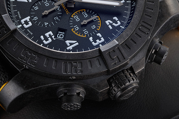 曾經有段時期,眾多品牌接連發表大尺寸錶款,直徑超過45mm的錶款可說是家常便飯,甚有不少突破50mm者。然而考量到實際配戴感受(尺寸是否能符合大多數人的手腕尺寸,不致配戴時會晃來晃去,或是大尺寸帶來的重量),這股大錶風潮終究收斂,雖然已經回不去過往38mm便是男錶恰到好處尺寸的時代,但還是相對合理的尺寸。許多事物總是相輔相成,例如隨著汽車速度變快,而有發展出更安全的結構,隨著大錶風潮的興起,尋求運用輕量耐用的材質也成為品牌談討的項目之一。而BREITLING百年靈在2016年,也以獨家Breitlight材質,打進輕量化領域。此款Avenger Hurricane 12H,是品牌以2016年發表的Avenger Hurricane為基礎的改款。同樣採用Beritlight材質,基本形貌與前作大同小異,主要差別在於由24小時制改為12小時制,對於當前一般使用習慣來說,可說更為方便。