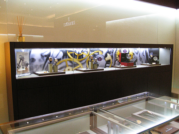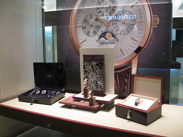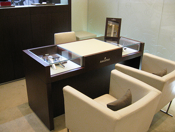 位於左側的展示櫃中,主要放置Royal Oak的大三針、星期日期錶款與特殊限量錶。而下方的平面展示櫃中,則是以Jules Audemars與千禧系列錶款為主。